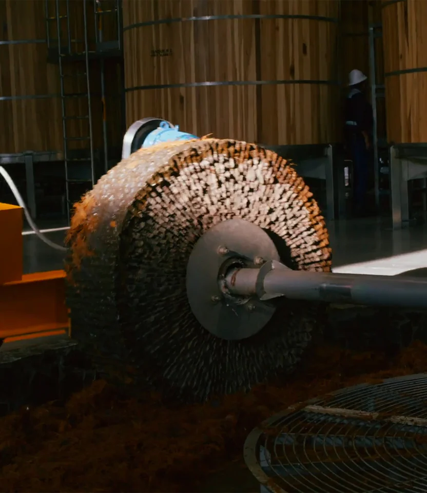 然后我们用电动的Tahona石坑碾碎熟龙舌兰——每个轮重800公斤,能实现最佳榨汁和收集。这种技术在龙舌兰酿造中已经使用了几个世纪,是最传统的方法。